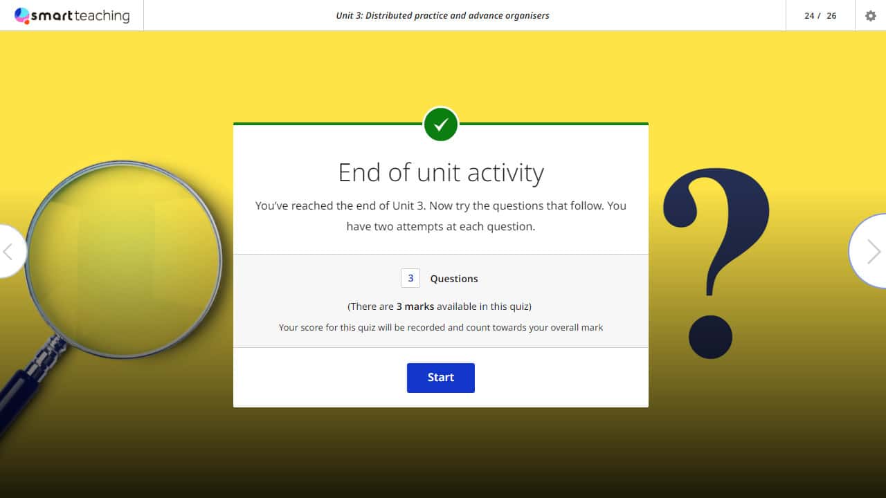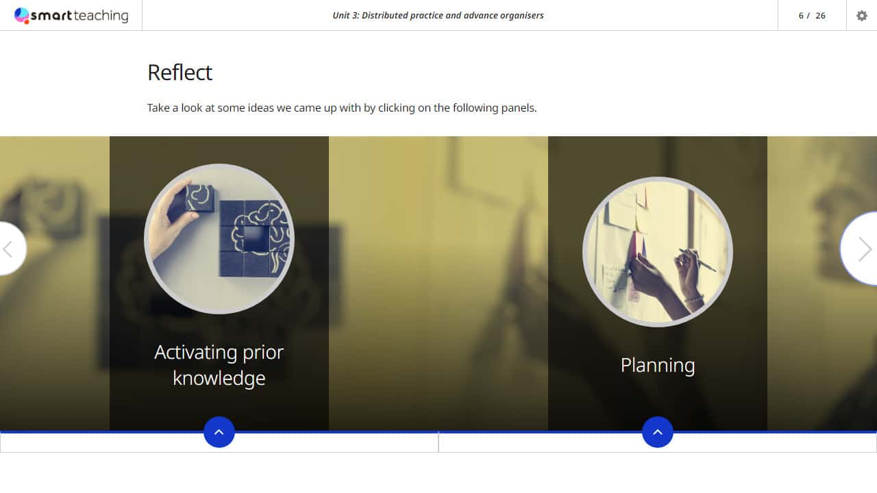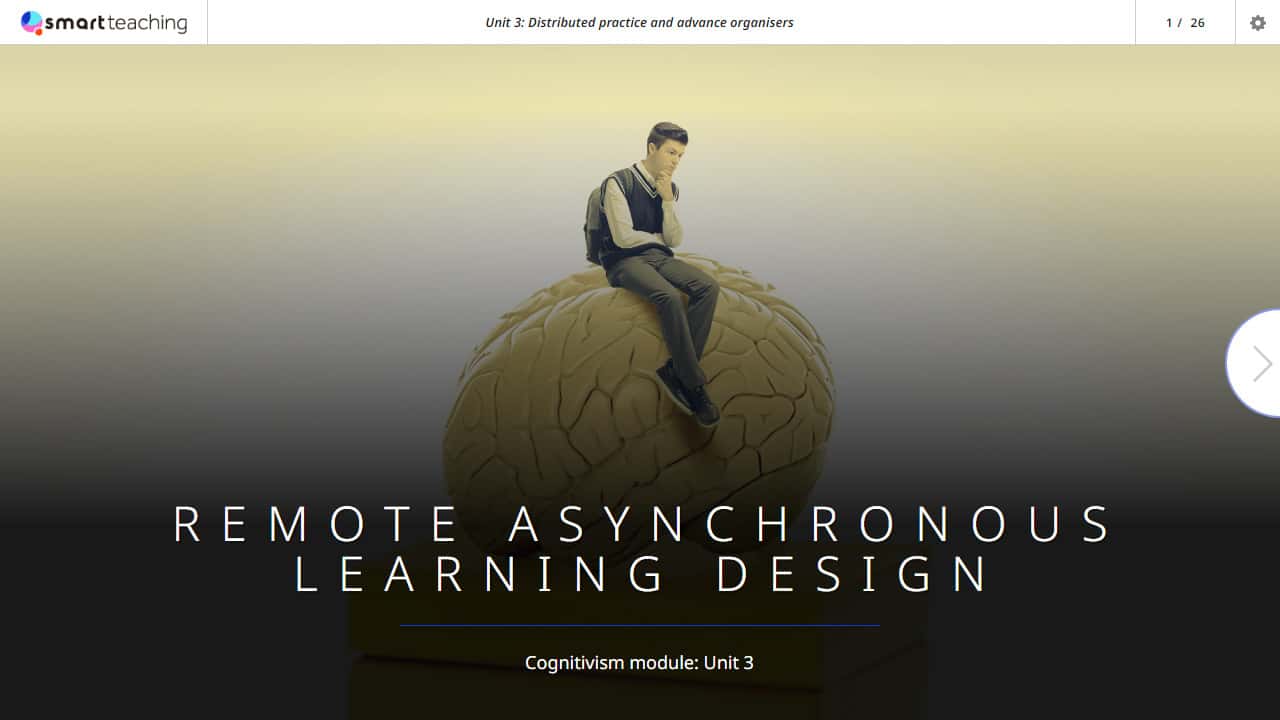 Smart Teaching e-learning modules follow a linear structure. Each module is broken down into units. Practitioners should work through the modules and units sequentially. After completing the e-learning modules, practitioners will be asked to attend several synchronous remote workshops at a date and time to be arranged.